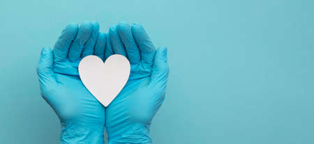 Doctors hands wearing blue surgical gloves holding a white heart shape