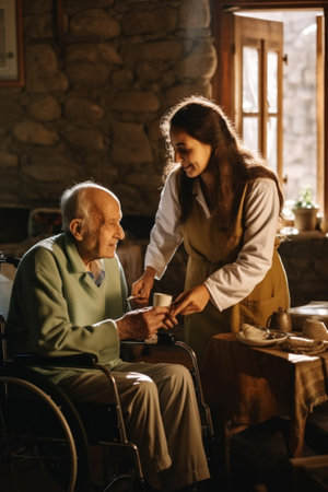 Generative AI : friendly nurse and an old patient in a clinic
