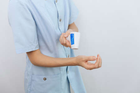 The medical worker gathered his hands in fists. On white background. Language of the body.