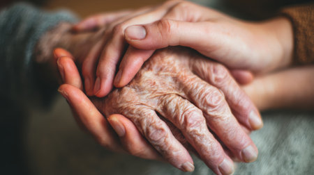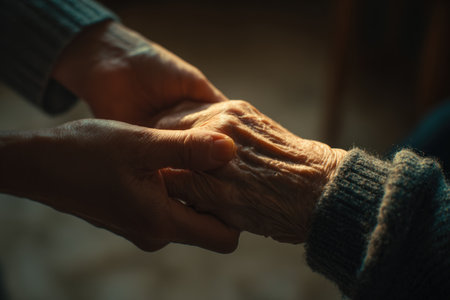 Elderly hand held gently by younger hand showing care and compassion in warm light