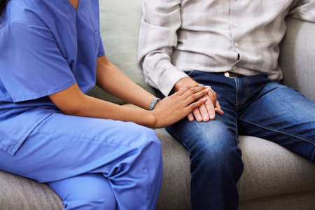 Female friend or family holding hands during cheer up to mental depress man, Psychologist provides mental aid to patient. PTSD Mental health concept