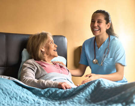 A warm moment captured as a smiling nurse provides comfort to an elderly patient, reflecting the compassionate nature of nursing care.