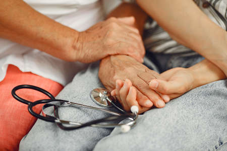 Close up granddaughter takes care of the health sick grandmother at home by holding hands. Lifestyle support the love of the family.