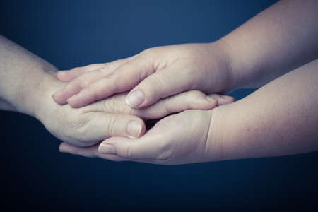 Hands of elderly and young women on black background. Toned.