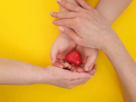 Old and young hands. Hands of the old woman - 84 years covered with young hands