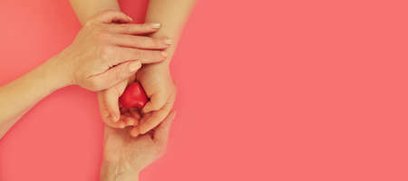 hands of mom and baby hold a heart on a colored background