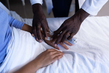 Midsection of african american male doctor putting oximeter on finger of patient in hospital bed. medicine, health and healthcare services.