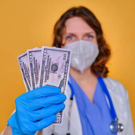 A medical doctor keeps a salary in us dollars. A nurse with money for work and a protective mask on a yellow background