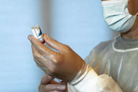 Close-up of the hands of a nurse preparing an injectable dose of a vaccine. concept
