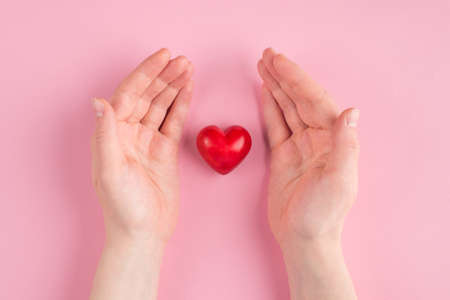 Health, medicine and charity concept - close up of female hands with small red heart