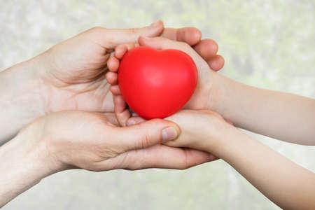 Love and Valentine's day concept. Adult and child hands holding red heart, family , love and good relationship.