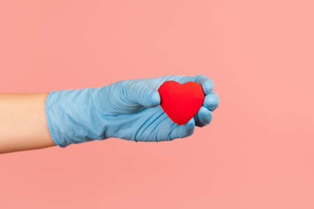 Profile side view closeup of human hand in blue surgical gloves holding small red heart shape in hand. indoor, studio shot, isolated on pink background.