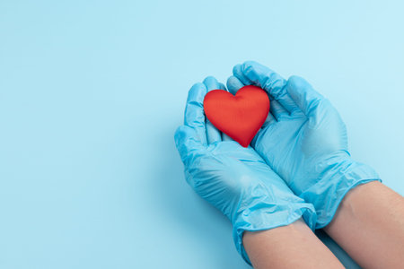 Female hand wearing blue medical gloves holding red heart over light blue background. Health care, heart disease, cardiology