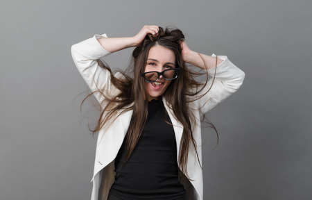 white young woman in a white jacket is happy, crazy, a businesswoman with long hair and glasses is laughing on a gray background