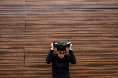 covering from taxes and government charges. high fees and difficulties for small business. man hiding under his briefcase. free space concept