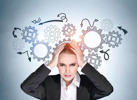 Boss woman with headache, arrows with cogwheels and lines. Challenge and too many tasks to do. Concept of solving problem and tension