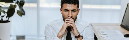 panoramic shot of pensive bi-racial trader looking away in office
