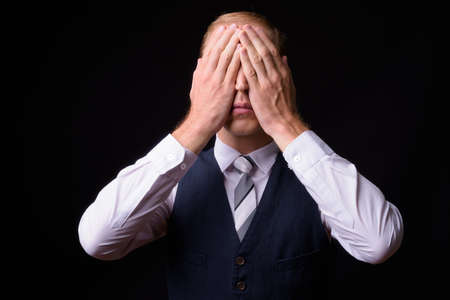 Businessman with blond hair against black background