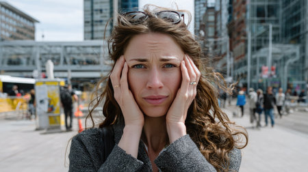 A young woman with curly hair shows a worried expression while standing in a busy urban environment, capturing the essence of stress and anxiety in city life.