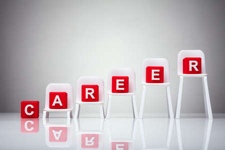 Red Cubic Blocks With Career Word On Increasing Scale Of Chairs Over Reflective Background