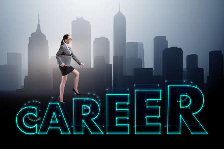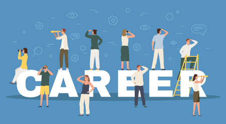 A group of characters runs along the top of the green word 'CAREER', which is shaped like an upward arrow, symbolizing professional growth and advancement.