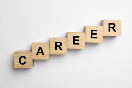 Chart with words Career. Career stair concept. Ivory tiles with capital letters on mahogany board.