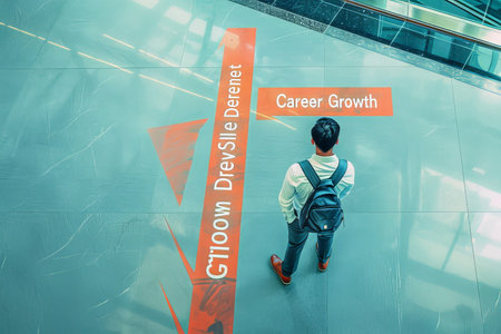 Worker at painted crossroads in office, signs: Career Growth, Skill Development, symbolizing career decisions.