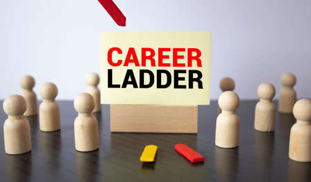 male hand pushes a piece of wood with text Career Ladder from other pieces of wood
