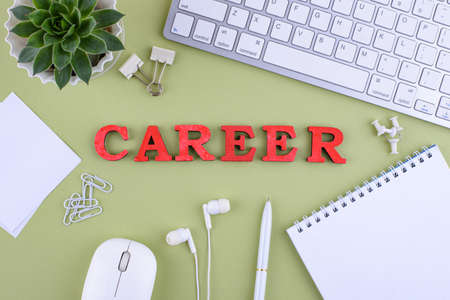 Career growth concept with letters on cubes. Still life of office workplace with supplies. Flat lay vintage wooden desk with computer keyboard and leather wallet. Professional human resources hiring