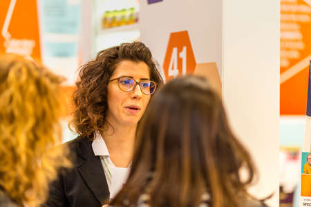 BOLOGNA (BO), ITALY - APRIL 12, 2019: exhibitor is welcoming visitor at Cosmofarma Exhibition, the pharmacy world’s leading European
