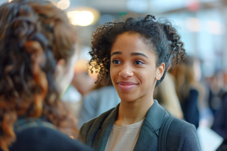 Two women, one with curly hair, engaging in conversation at a career fair to network, A student attending a career fair to network with professionals