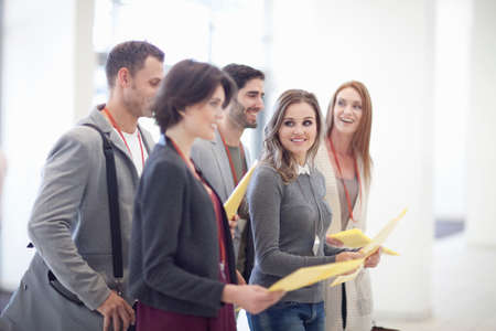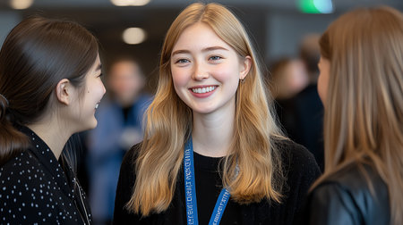 Businesswoman wearing a lanyard with a badge, smiling and engaging with others during a corporate event or conference setting