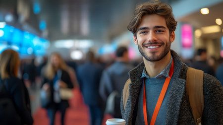 Young man observes technology exhibits at a bustling trade show in a convention center