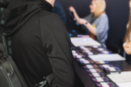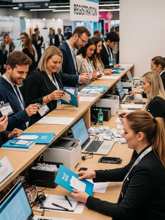 Process of checking in on a conference congress forum event, registration desk table, visitors and attendees receiving a name badge and entrance wristband bracelet and register an electronic ticket
