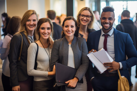A diverse group of women leaders, clad in professional attire, networking at a high-profile business conference, exchanging ideas and forging connections that transcend cultural boundaries, united in their pursuit of excellence.