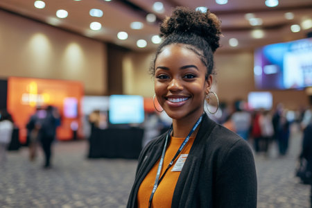 A young Black businesswoman, with a cheerful smile, poses at a convention center during a lively conference. The background includes a spacious event hall, interactive displays, and a crowd of attendees.