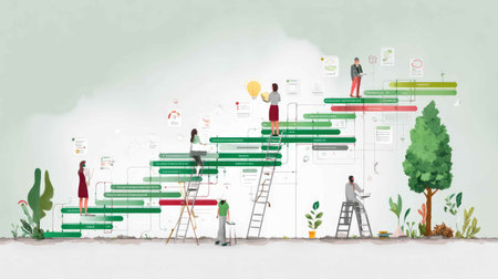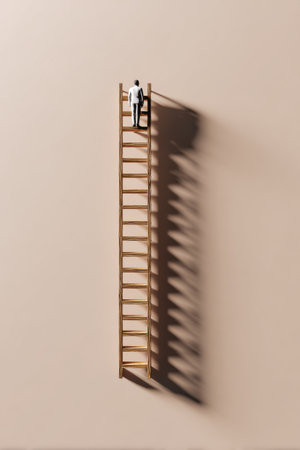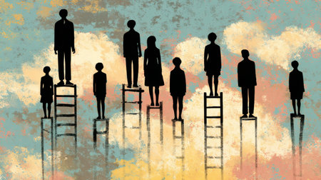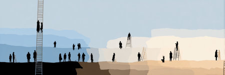 This illustration showcases a diverse group of individuals at varying heights on ladders, symbolizing growth and teamwork in a professional environment, inspiring confidence and ambition.