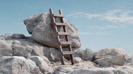 A broken wooden ladder stands against a large rock under a blue sky, representing a pursuit of unreachable dreams and ambitions.