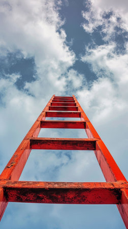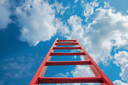 Red ladder reaching into a blue sky with clouds, upward perspective. Ambition and aspiration concept