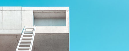 Modern concrete building with ladder against blue sky, architectural minimalism concept