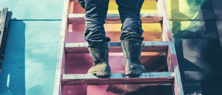 A person in boots climbs a ladder to reach the top of a colorful mural during a creative art project on a bright day.