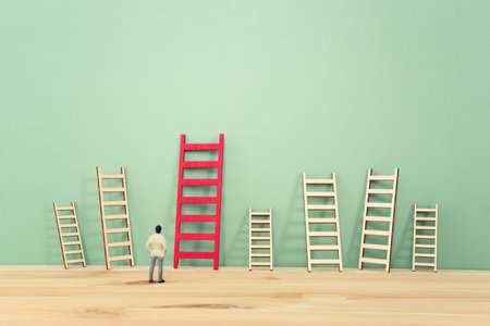 Concept of miniature figure looking at red ladder. idea of aiming high and achieving success
