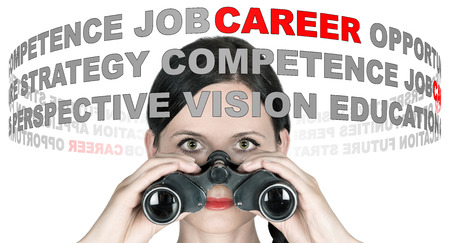 businesswoman thinking about her career visualized by the word CAREER formed as a stair in front of a blackboard