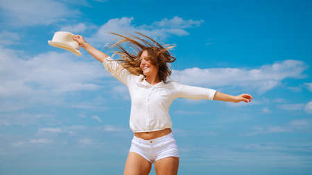 Success, freedom or triumph concept. Cute attractive caucasian elegant girl dancing against blue cloudy sky. Online shopping, shopaholic or discounts. High quality image