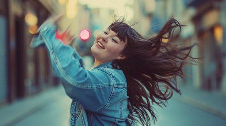 Beautiful happy plus size girl dancing on the street with flying hair. Body love concept. Generative AI.