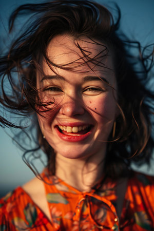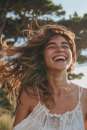 A woman caught in a moment of carefree abandon, her face a picture of sheer delight as she embraces a moment of pure happiness.