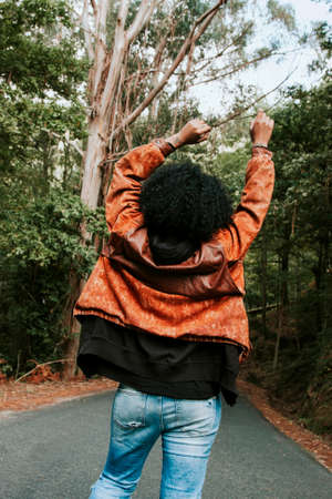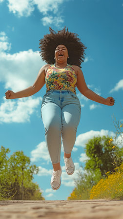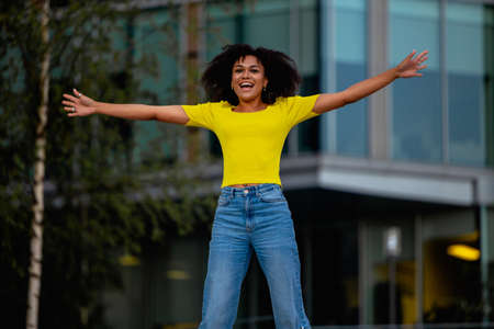 young African-American woman dancing and jumping happily in the street. generated with AI