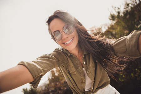 Photo of positive charming lady make selfie enjoy sunny day wear brown shirt eyeglasses park street outdoors