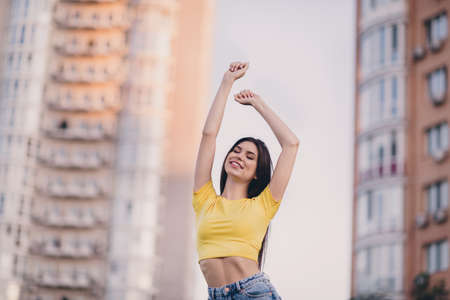 Photo of adorable satisfied person closed eyes raise hands beaming smile enjoy free time walk outside