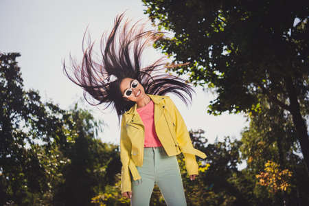Photo of cheerful positive charming young lady throw hairdo enjoy free time nice weather outside